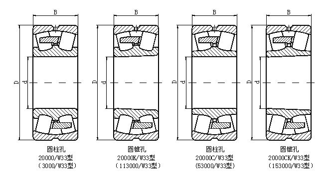 調心滾子軸承為雙列球面滾子軸承,內圈有兩列滾道,外圈為球面滾道,外圈滾動面中心與軸承中心一致。自動調心性能好,可補償軸與外殼孔之間的安裝誤差或軸撓曲使內外圈產生的傾斜即同軸度誤差。該類軸承徑向負荷能力較大,同時也可承受任一方向的軸向負荷,單不能承受純軸向負荷,特別適用于重載荷或振動沖擊載荷下的工作。